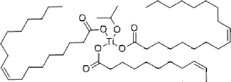 | Product Name:isopropyl trioleyl titanate CAS NO:136144-62-2 Molecular Formula:C57H106O7Ti Structural Formula: